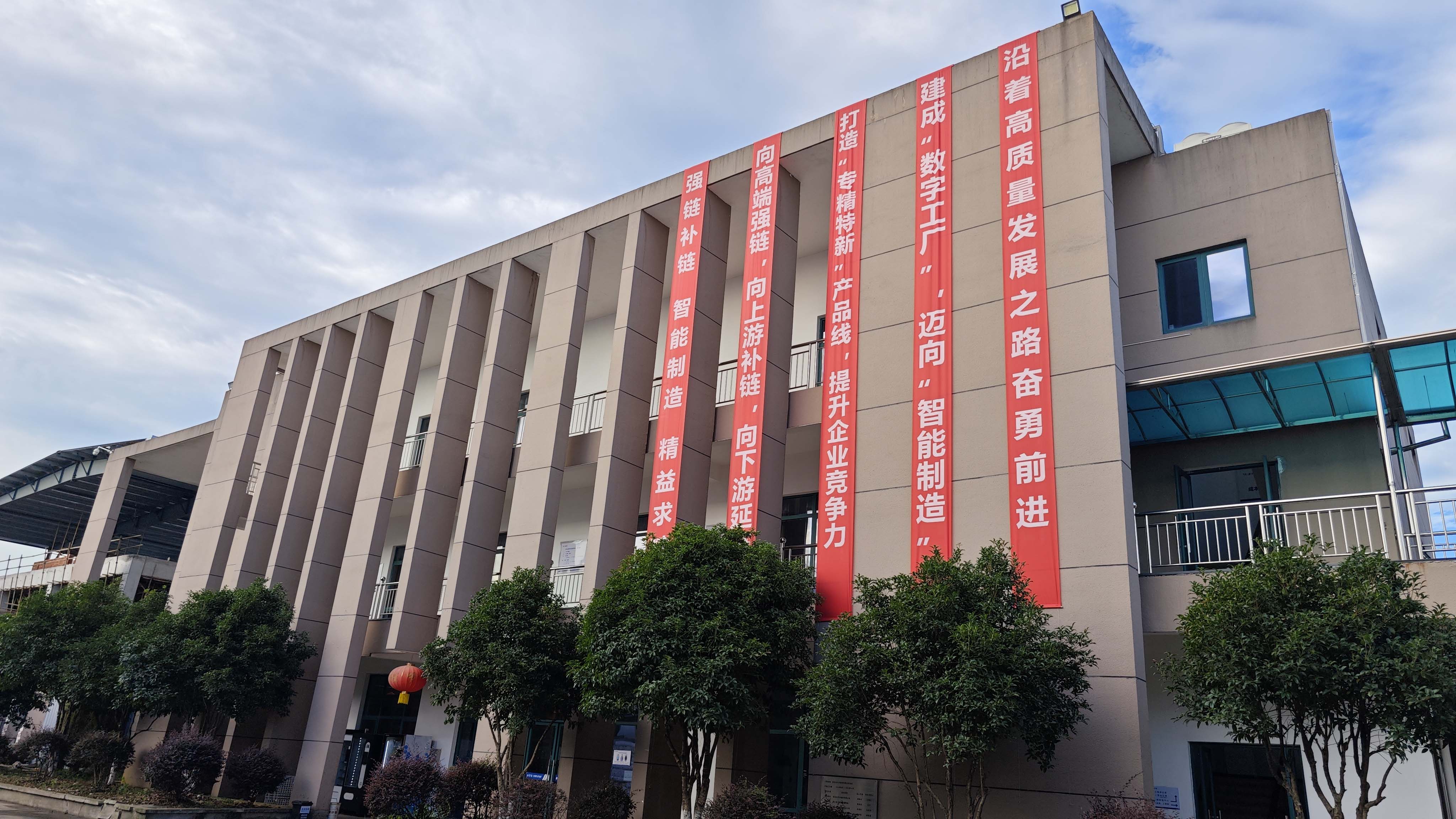 bifa必发安吉基地行政办公楼辅楼悬挂的上半年谋划事情大会宣传竖幅格外醒目